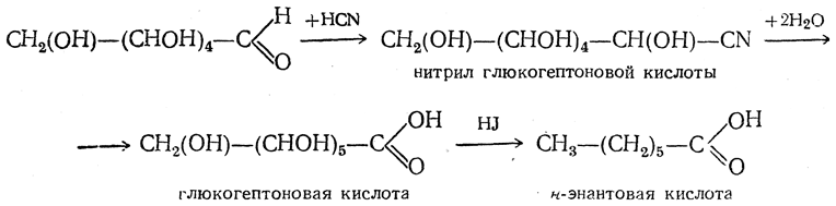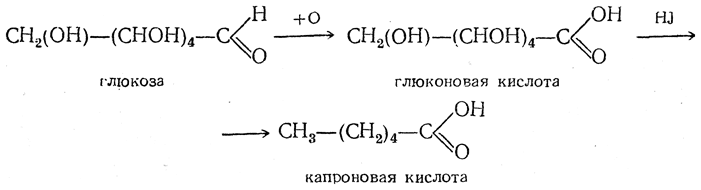 Кроме того, окисление глюкозы бромной водой приводит к получению глюконовой кислоты, которая при восстановлении иодистым водородом переходит в нормальную капроновую кислоту: