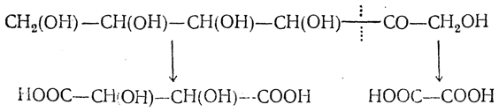 Изомер глюкозы — фруктоза, имеющая тот же состав С6Н12О6, при энергичном окислении азотной кислотой расщепляется на винную и щавелевую кислоты. Это становится понятным, если допустить в молекуле фруктозы наличие кетонной группы в положении 2 в нормальной шестиуглеродной цепи: