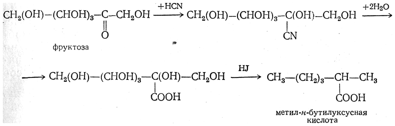 Фруктоза также присоединяет синильную кислоту. Омыление образующегося при этом нитрила дает оксикислоту с разветвленной цепью. Эта оксикислота восстанавливается в метил-н-бутилуксусную кислоту (2-метилкапроновую), что подтверждает правильность для фруктозы формулы пятиатомного кетоноспирта: