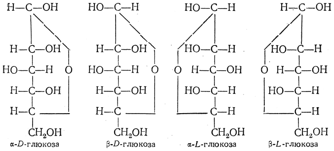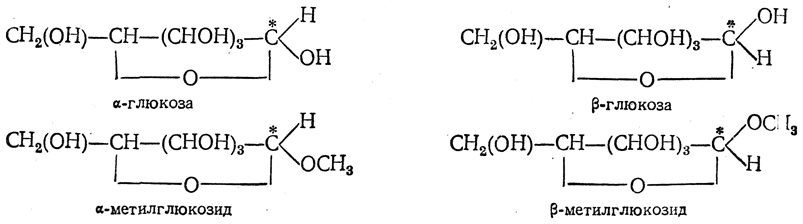 α- и β-Формы моносахаридов. Каждая циклическая форма моносахаридов благодаря появлению нового асимметрического углеродного атома, входившего ранее в карбонильную группу, должна существовать, так же как и ее производные, в двух модификациях. Такие модификации были вначале неизвестны. Однако в дальнейшем из глюкозы удалось получить дзе стереоизомерные модификации метилглюкозида, названные α-и β-глюкозидами (Э. Фишер, Ван-Экенштейн, 1893—1894), а затем выделить две модификации свободной глюкозы (Танре, 1895) и других моносахаридов. По аналогии с α- и β-глюкозидами они были названы α- и β-формами: