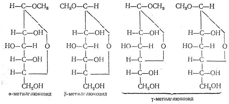 Э. Фишер еще в 1914 г. выделил, кроме α- и β-метилглкжозидов, еще третий глюкозид, названный им γ-глюкозидом. Он оказался смесью двух глюкозидов с пятичленным кольцом, которые находятся друг к другу в таком же отношении. как α- и β-глюкозиды с шестичленным циклом: