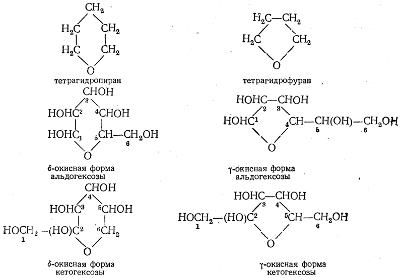 Окисные формы моносахаридов с полным правом можно рассматривать как производные гетероциклических соединений: шестичленные — как производные пирана, а пятичленные — как производные фурана, точнее как производные тетрагидропирана и тетрагидрофурана: