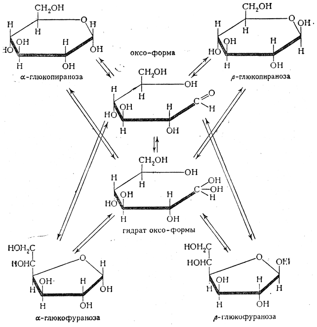 По-видимому, в зависимости от условий (в частности, температурных) промежуточной формой при взаимных превращениях α- и β-форм (как пираноз, так и фураноз) может быть оксо-форма или ее гидрат. Сложную систему динамического равновесия в водном растворе глюкозы следует, вероятно, представлять таким образом: