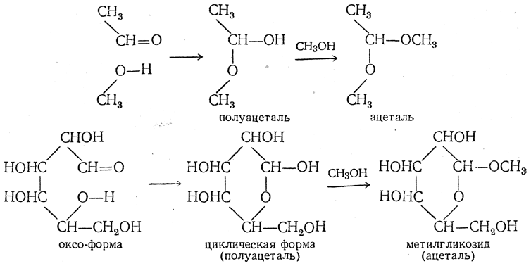 Свойства гликозидов, казавшиеся весьма своеобразными, также получили теперь естественное объяснение. Если циклические формы моносахаридов являются полуацеталями, то гликозиды являются циклическими ацеталями, что видно из следующего сопоставления: