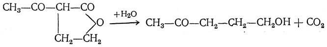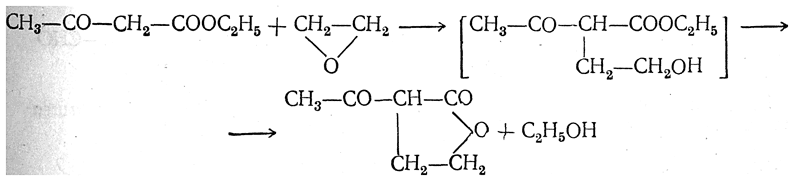 4. Конденсация натрийацетоуксусного эфира с окисью этилена. Таким путем может быть легко получен γ-ацетопропиловый спирт, или 4-кетопентан-1-ол (И. Л. Кнуньянц, Г. В. Челинцев, Е. Д. Осетрова). Схематически процесс можно представить так: