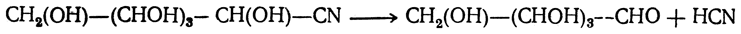 Последние при действии аммиачного раствора окиси серебра отщепляют молекулу синильной кислоты, образуя низшие монозы: