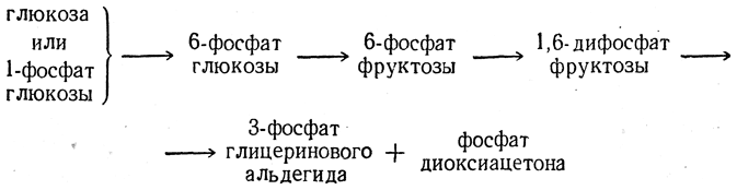 При биологических превращениях углеводов (гликолизе и спиртовом брожении) постоянно происходит следующая цепь превращений гексозы и ее фосфорнокислых эфиров: