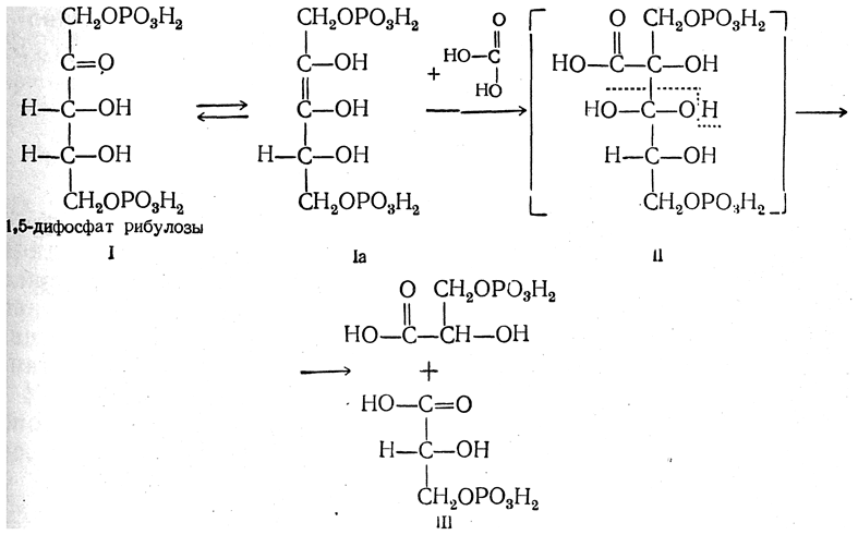 «Акцептором» углекислоты оказался 1,5-дифосфат рибулозы (I), который в енольной форме (1а) присоединяет углекислоту и через гипотетический промежуточный продукт (II) образует две молекулы 3-фосфата глицериновой кислоты (III):