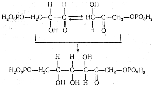 Фосфаты глицеринового альдегида и диоксиацетона дают путем альдольной конденсации 1,6-дифосфат фруктозы: