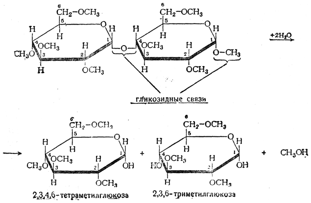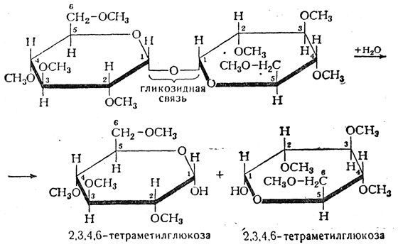 Сущность метода метилирования заключается в следующем. Действием на дисахарид иодистого метила или диметилсульфата (в щелочной среде) атомы водорода всех гидроксильных групп замещают на метальные группы. При метилировании дисахаридов, построенных, например, из гексоз, образуются октаметилзамещенные дисахариды. После метилирования проводят осторожный кислотный гидролиз, в результате которого метилированный дисахарид расщепляется на метилированные моносахариды. Изучение строения метилированных моносахаридов, в частности определение расположения свободных гидроксилов, дает возможность заключить, за счет каких гидроксильных групп были связаны в дисахариде остатки простых сахаров. При кислотном гидролизе метилированных дисахаридов типа мальтозы, кроме расщепления гликозидной связи, соединяющей два остатка моносахарида, будет происходить также гидролиз метилгликозидной связи одного из остатков моносахарида (имевшего до метилирования свободный полуацетальный гидроксил, отсутствующий у дисаларидов типа трегалозы). Таким образом, если гидролизовать октаметил производные дисахаридов типа трегалозы и типа мальтозы, то в первом случае получаются две молекулы тетраметилгексозы, а во втором — молекула тетраметилгексозы и молекула триметилгексозы.