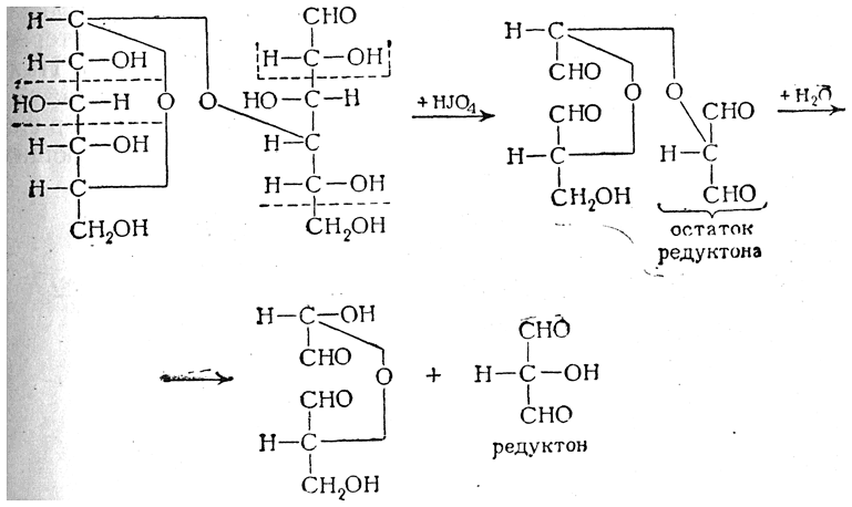Периодатный метод, широко применяемый в последнее время в химии высших полиоз, дает возможность, в частности, отличить в дисахаридах связи 1,4' и 1,6' При действии йодной кислоты на дисахарид, содержащий связи 1,4', выделяется иод, тогда как при наличии связи 1,6' иод не выделяется. Выделение иода из иодной кислоты обусловлено, по-видимому, восстанавливающим действием образующегося редуктона О=СН—СН(ОН)—СН=О: например мальтоза (связь 1.4') в аль-форме реагирует с иодной кислотой:
