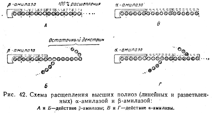 α-Амилазы расщепляют главным образом каждую пятую или шестую α-гликозидную связь цепи полиозы, причем места ветвлений не являются препятствием их действию (рис. 42).