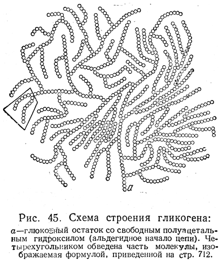 Гликоген еще более разветвлен, чем амилопектин. Строение молекулы гликогена можно изобразить схемой, приведенной на рис. 45, а строение части молекулы, обведенной на этой схеме четырехугольником, — формулой, приведенной ниже: