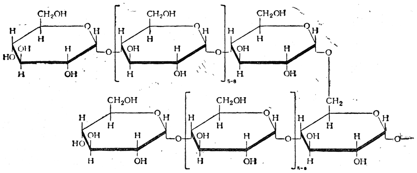 Он представляет собой сильно разветвленную цепь, построенную из глюкозных остатков, соединенных главным образом связями α-1,4'; в точках ветвления имеются связи α-1,6'. Как показало изучение β-декстринов, образующихся при расщеплении гликогена β-амилазой, точки ветвления в центральных частях молекулы разделены лишь тремя-четырьмя глюкозными остатками; периферические цепи гликогена состоят в среднем из семи — девяти глюкозных остатков.