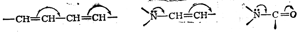 Как мы уже указывали, природу сопряжения двойных связей можно интерпретировать как результат большой подвижности π-электронов, смещение которых происходит во всей сопряженной системе в делом. Роль π-злектронной пары одной из связей сопряженной системы может играть необобщенная пара р-электронов таких атомов, как N, О, S и т. п. Для того чтобы отразить этот вид взаимного влияния в структурных формулах, смещения π-электронов обычно отмечают изогнутыми стрелками, проведенными, например, от кратной связи С = С к простой связи С—С или от атома с неподеленной парой р-электронов к простой связи в направлении смещения: