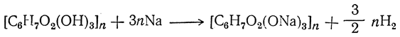 Как и глюкозе, целлюлозе свойственны реакции многоатомного спирта, так как каждый элементарный остаток С6Н10О5 содержит три спиртовых гидроксила. В связи с этим формулу целлюлозы часто сокращенно пишут в виде [С6Н7О2(ОН)3]n (вследствие большой величины п концевые остатки глюкозы, содержащие по 4 свободных гидроксила, практически не влияют на ее свойства и могут не учитываться).