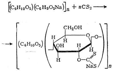 Ксантогенаты целлюлозы получаются при взаимодействии щелочной целлюлозы с сероуглеродом, При этом CS2 как бы внедряется в положение 2 в среднем в каждый второй глюкозный остаток щелочной целлюлозы: