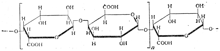 состоящую из соединенных связями α-1,4' остатков D-галактуроновой кислоты, карбоксильные группы которой в той или иной степени этерифицированы метиловым спиртом; часть атомов водорода карбоксильных групп бывает замещена одинаковыми или разными катионами (в частности, катионами многовалентных металлов).