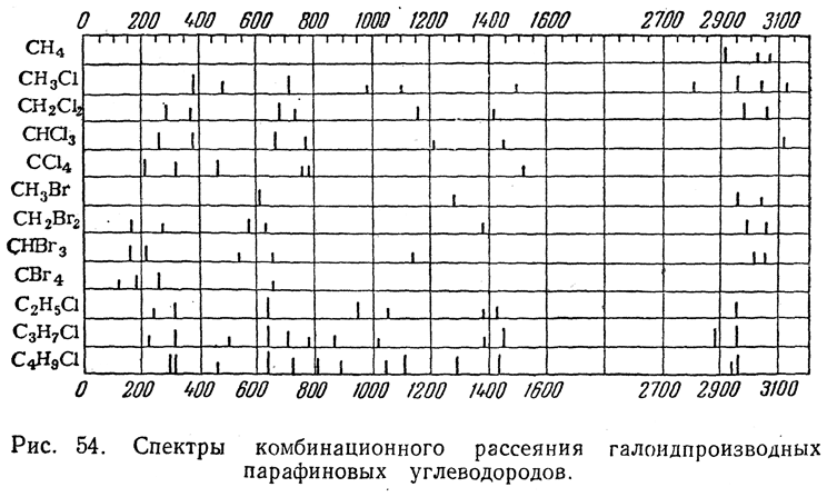 На диаграмме (рис. 54) сопоставлены спектры комбинационного рассеяния ряда галоидпроизводных парафиновых углеводородов. Высота отдельных штрихов, изображающих положение наблюдаемых в спектрах линий, соответствует относительной интенсивности этих линий. По оси абсцисс отложены частоты колебаний для этих линий, выраженные в так называемых обратных сантиметрах (см–1). Сравнивая спектры для СН4 и ССl4
