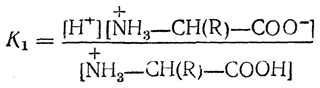 Обычно пользуются не самой величиной К1, а по аналогии с рН — ее отрицательным логарифмом рК=—lgК1 Величина pK1 простейшей аминокислоты — глицина равна 2,34, т. е. при кислотности, соответствующей рН=2,34, концентрация биполярных ионов NH3—СН2—СОО– равна концентрации катионов