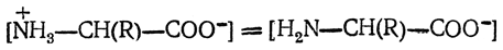 В пользу такого строения аминокислот свидетельствует ряд экспериментальных данных. Известно, что слабо диссоциированные алифатические кислоты в водных растворах обнаруживают в спектре комбинационного рассеяния характерную для карбоксильной группы линию (частота ~1650 см–1), которая при добавлении сильной щелочи исчезает, так как образующаяся соль почти полностью диссоциирована. Первичные амины в свою очередь обнаруживают в спектре комбинационного рассеяния интенсивные линии с частотой 3320—3380 см–1 В спектрах комбинационного рассеяния растворов аминокислот и те и другие линии отсутствуют. Однако при подкислении раствора аминокислоты появляется линия, отвечающая карбоксильной группе (превращение СОО– → СООН), а при подщелачивании — линия, характерная для аминогруппы (превращение +NH3 → NH2).