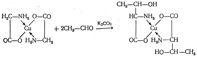 Треонин получается взаимодействием глицина с ацетальдегидом. Глицин предварительно превращают во внутрикомплексную медную соль, так как при этом резко повышается реакционная способность метиленовой группы. Активированная метиленовая группа глицина легко реагирует с карбонильной группой, например ацетальдегида, по типу альдольной конденсации: