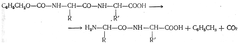 При восстановлении водородом на палладиевом катализаторе или натрием в жидком аммиаке карбобензоксипроизводное легко разлагается на аминокислоту (или пептид), толуол и углекислоту, например: