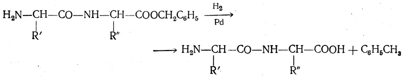Карбоксильную группу обычно защищают путем этерификации, а после проведения синтеза освобождают карбоксил щелочным гидролизом. Чаще всего применяются метиловые и этиловые эфиры аминокислот и пептидов. В настоящее время все шире используются бензиловые эфиры аминокислот, преимущество которых состоит в том, что удаление бензильного остатка может быть достигнуто не только омылением, но и более мягко — каталитическим гидрированием: