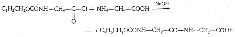 Все способы активирования карбоксильной группы имеют целью усилить электрофильность карбонильного углерода. Это достигается введением в карбоксильную группу аминокислоты электроноакцепторных атомов или группировок, вызывающих понижение электронной плотности у карбонильного углерода.1. Применение х л орангидридов. Превращение ациламинокислот в соответствующие хлорангидриды является одним из наиболее старых способов активирования карбоксильной группы (Э. Фишер). Так, хлорангидрид карбобензоксиглицина легко реагирует с глицином в щелочной среде, образуя карбобензоксиглицил-глицин: