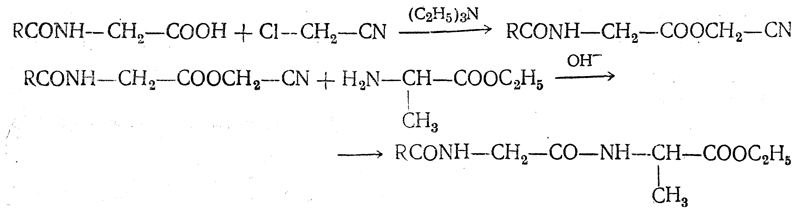 Действуя на ациламинокислоту хлорацетонитрилом в присутствии основания, получают цианметиловый эфир ациламинокислоты, легко реагирующий с эфиром незамещенной аминокислоты: