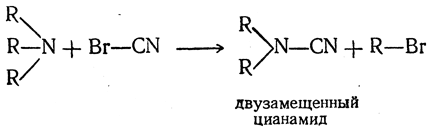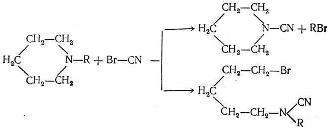Для исследования сложных третичных аминов, в том числе и природных алкалоидов, большое значение имеет реакция между бромистым цианом и третичными аминами. С простейшими третичными аминами реакция идет согласно уравнению