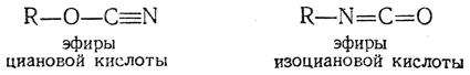 Как видно из приведенных формул, циановая и изоциановая кислоты находятся в таутомерных отношениях. Как и в случае синильной кислоты, до настоящего времени известна лишь одна циановая кислота. Соли ее также существуют лишь в одной форме. В то же время сложные эфиры, т. е. продукты замещения в циановой кислоте водорода на углеводородные радикалы, известны в обеих изомерных формах