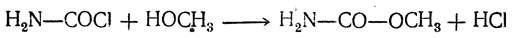 Этот хлорангидрид представляет собой жидкость с чрезвычайно резким запахом. Со спиртами он дает сложные эфиры — уретаны (см. ниже):