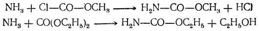 . Сложные эфиры карбаминовой кислоты называются уретанами. Их можно получить действием аммиака и первичных аминов на эфиры хлоругольной кислоты или на средние эфиры угольной кислоты