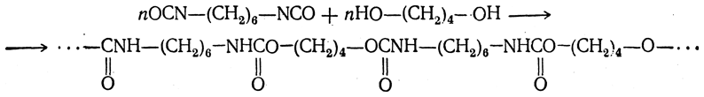 , в состав которой входит амидная группа. Полиуретаны получают главным образом полимеризацией диизоцианатов с гликолями. Например, полимеризацией гексаметилендиизоцианата с бутандиолом-1,4 получается полиуретан, выпускаемый под фирменным названием «перлон U»: