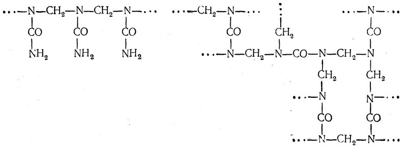 При осторожном проведении конденсации мочевины с формальдегидом в присутствии щелочей сначала образуются, в зависимости от взятого соотношения компонентов, два мономерных кристаллических продукта: монометилолмочевина NH2—CO—NH—СН2ОН (т. пл. 110° С) и диметилолмочевина НОСН2—NH—СО—NH—СН2ОН (т. пл. 125°С). При дальнейшем нагревании метилольные производные, отщепляя элементы воды, превращаются, особенно легко в кислой среде, в ненасыщенные метилен- и диметиленмочевину