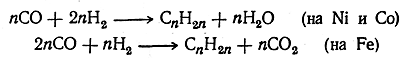 При атмосферном давлении и температуре около 200° С над катализаторами, содержащими восстановленный никель, кобальт или железо, идет образование углеводородов по уравнениям:
