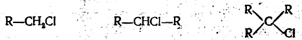 За исключением метила, все остальные алкилы могут иметь при том атоме углерода, который связан с галоидом, еще два атома водорода, или еще один атом водорода, или же не содержать ни одного водородного атома. Следовательно, этот атом углерода связан с одним радикалом, или с двумя радикалами, или с тремя радикалами соответственно формулам (R — любой углеводородный остаток):