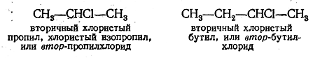 Алкилы первого рода называются первичными, второго—вторичными (перед названием радикала обычно пишут втор-) и третьего — третичными (сокращенно трет-). В качестве примеров простейших галоидных соединений с такими радикалами можно назвать соединения: