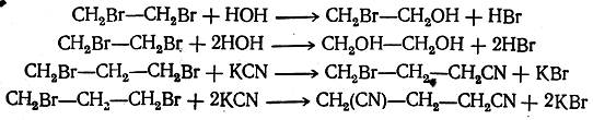 По химическим реакциям дигалоидные соединения можно разделить на два класса: 1) соединения, содержащие атомы галоида при разных атомах углерода, и 2) соединения, содержащие атомы галоида при одном и том же атоме углерода. Химические реакции первых в общем те же, что и у галоидных алкилов, с той лишь разницей, что в реакции вступают или только один, или сразу оба атома галоида. Примерами могут служить следующие реакции: