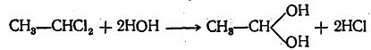 Соединения же типа хлористого этилидена СН3—СНCl2, содержащие два атома галоида у одного и того же атома углерода, обыкновенно обменивают при реакциях сразу оба атома галоида, например при действии воды: