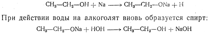 1. Образование алкоголятов Водородный атом гидроксильной группы при действии щелочных металлов способен заменяться на атомы этих металлов, причем получаются твердые, растворимые в спирте соединения, называемые алкоголятами: