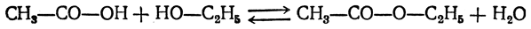 Сопоставляя реакцию этерификации с реакцией образования алкоголятов, можно видеть, что в спирте, как и в воде, очень слабые основные свойства сочетаются с еще более слабыми кислотными свойствами. В отличие от реакции нейтрализации, которая, как известно, представляет собой ионную реакцию, т. е. сводится к соединению ионов водорода и гидроксила, а потому идет моментально, реакция этерификации, как и громадное большинство реакций органических веществ, не является ионной реакцией и протекает медленно.