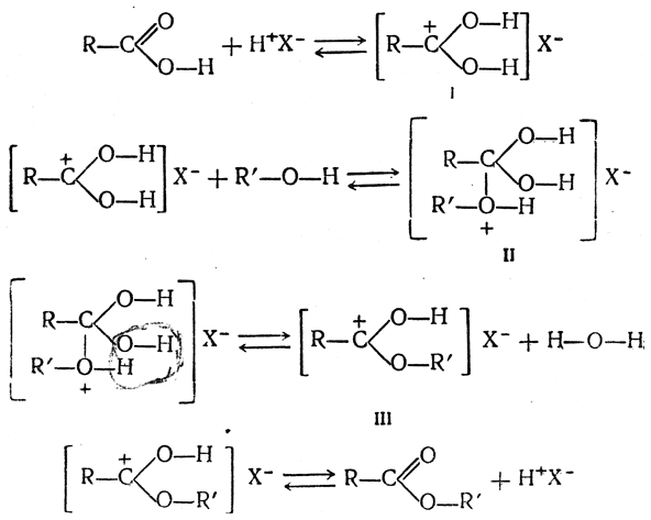 По этой схеме кислород карбонильной группы карбоновой кислоты, захватывая протон (катион минеральной кислоты), дает начало карбоний-иону I, который присоединяет молекулу спирта и образует сложный промежуточный оксониевый комплекс II, способный обратимо распадаться с отщеплением воды. и образованием карбоний-иона сложного эфира III. Последний, регенерируя минеральную кислоту (катализатор), дает молекулу сложного эфира.