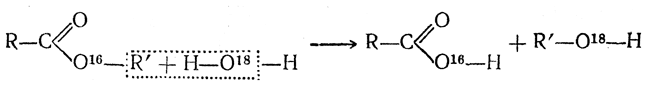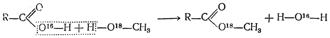 Пользуясь методом «меченых атомов», удалось показать, что при этерификации кислоты спиртом молекула выделяющейся при этом воды образуется из гидроксила кислоты и водорода спирта (как это и следует из приведенной выше схемы), а не из гидроксила спирта и водорода карбоксильной группы.