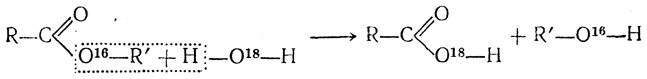 Аналогичное исследование процесса омыления сложных эфиров водой, содержащей тяжелый изотоп кислорода, показало, что омыление эфиров идет по схеме