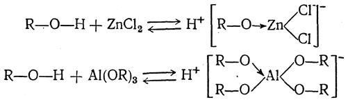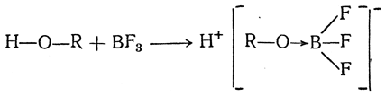 В некоторых случаях кислоты, образующиеся из спиртов, оказываются очень сильными кислотами, способными без разложения перегоняться в вакууме. Таковы комплексные соединения с трехфтористым бором типа BF3 · ROH: