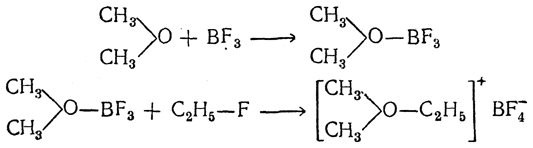 Интересные трехзамещенные оксониевые соли получены Меервейном (1937). При действии фтористого этила на продукт присоединения фтористого бора к диметиловому эфиру получается кристаллический тетрафтороборат диметилэтилоксония: