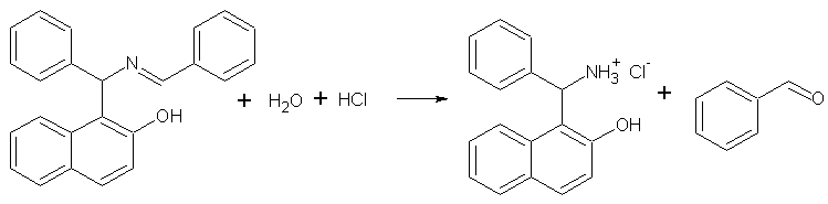 1-((альфа-бензилиденамино)бензил)-2-нафтол помещают в 5-литровую круглодонную колбу, подготовленную для перегонки с водяным паром, и смешивают с тройным-четверным объемом 20%-ной соляной кислоты. Затем смесь подвергают перегонке с водяным паром, чтобы удалить весь бензальдегид, образовавшийся при гидролизе, на что требуется около 2 часов (примечание 1). Во время перегонки выпадает объемистый осадок в виде светлорозовых или белых игл. По прекращении отгонки бензальдегида смесь в колбе хорошо охлаждают и кристаллы отсасывают. Выход: 240—260 г (84—91% теоретич.) продукта, плавящегося при 190—220°С с разложением (примечание 2).