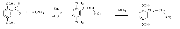 К раствору 100 г 2,5-диметоксибензальдегида в 220 г нитрометана добавили 10 г безводного ацетата аммония (ацетат подходящего качества можно получить из продажного "безводного" продукта, сохраняя его в вакуум-эксикаторе над пятиокисью фосфора) и полученную смесь грели на водяной бане в течение 2.5 часов. Избыток нитрометана удалили в вакууме, после чего темно-красный остаток самопроизвольно кристаллизовался. Сырой продукт промыли изопропанолом, отфильтровали и высушили на воздухе, получив 85 г (67%) 2,5-диметокси-бета-нитростирола в виде желто-оранжевого твердого вещества; его качество было достаточным для использования на следующей стадии без дополнительной очистки (которая может быть проведена путем кристаллизации из кипящего изопропанола).